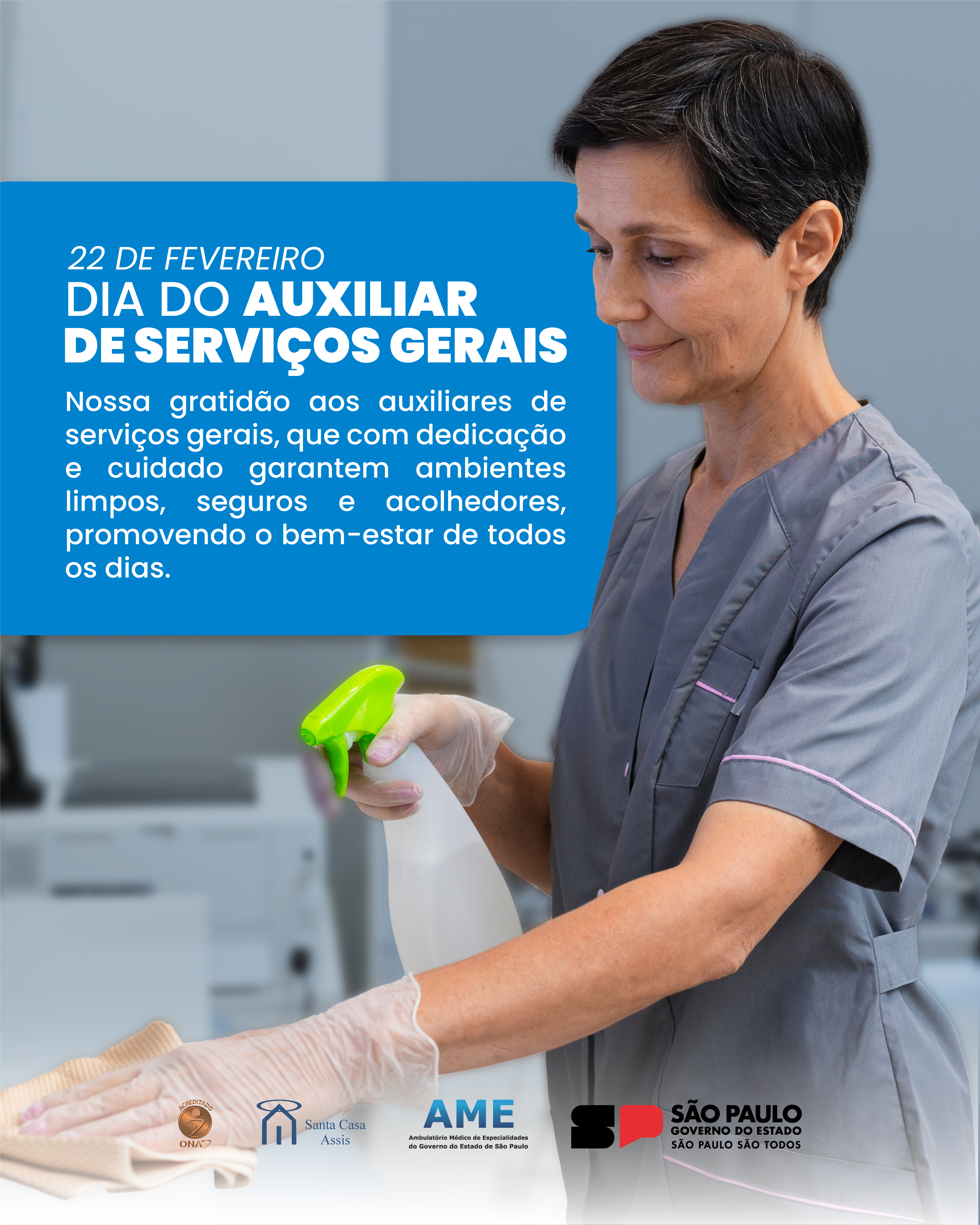 Agradecemos a dedicação de todos os Auxiliares de Serviços Gerais que transformam cuidado em cada detalhe e contribuem diariamente para a excelência dos serviços prestados à população.